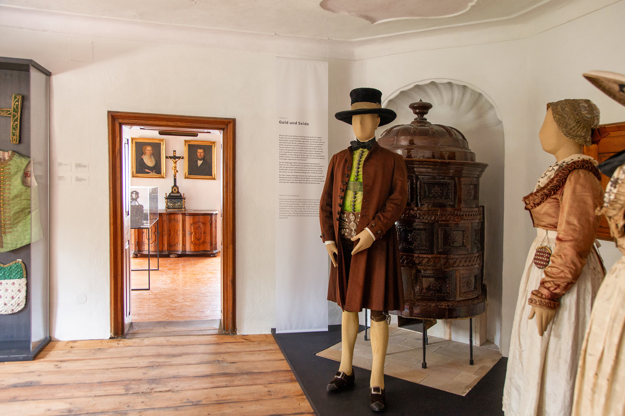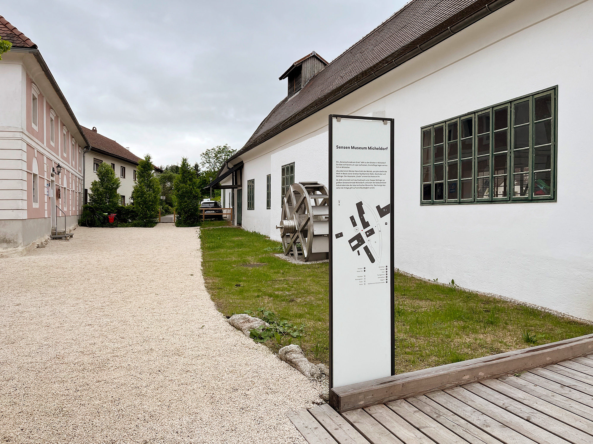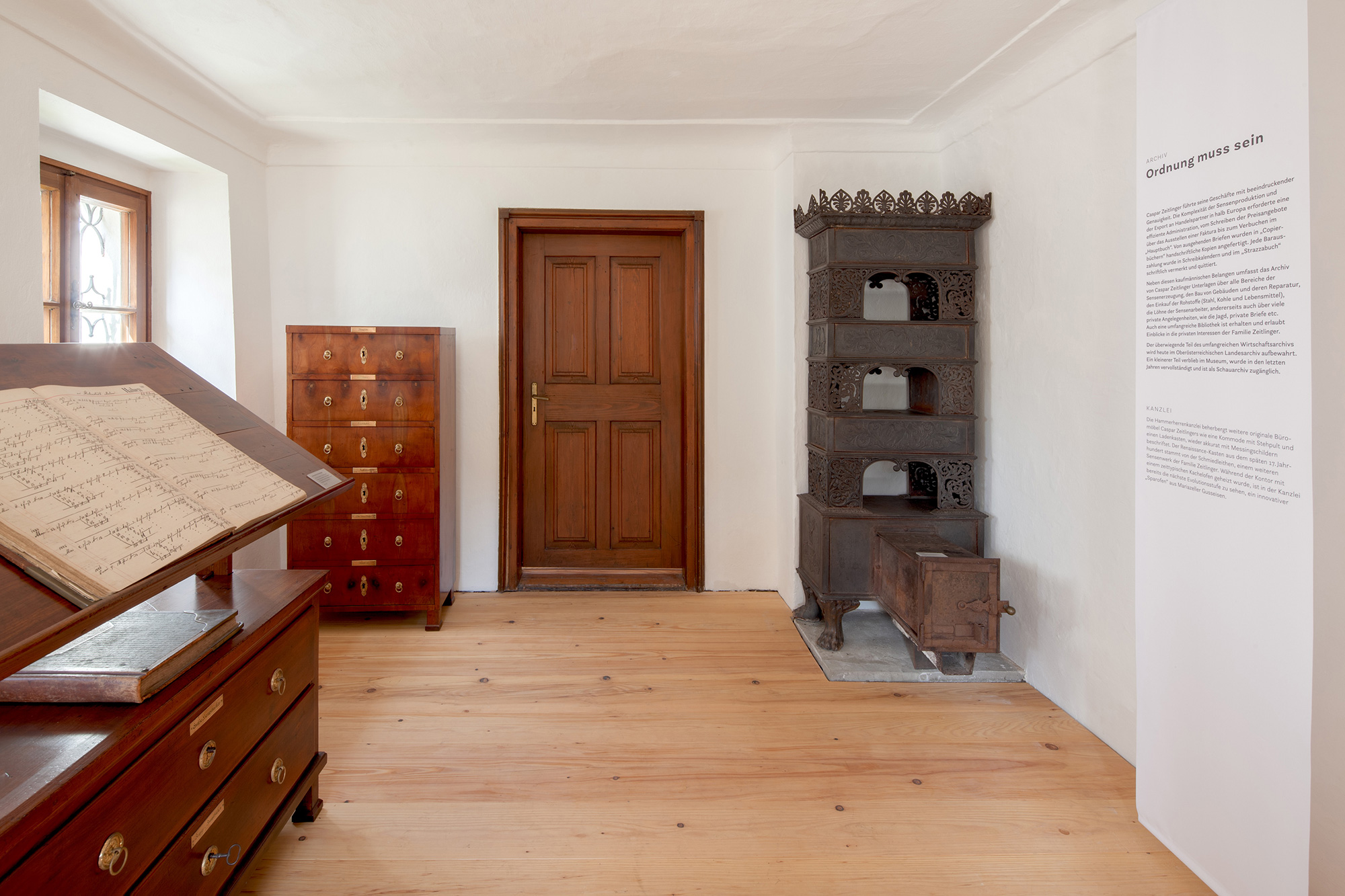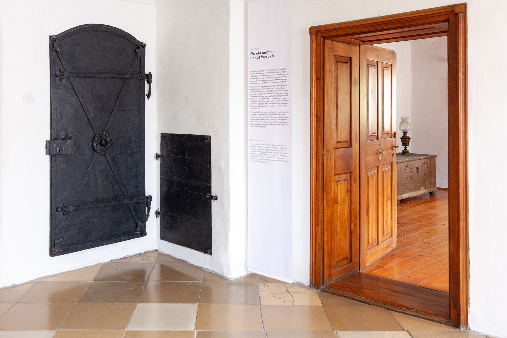 In Zusammenarbeit mit Martin Osen, dem Obmann des Sensenvereins, durften wir das Erscheinungsbild des liebevoll neu renovierten Sensenschmiede-Ensembles in Micheldorf neu gestalten – von der Entwicklung des Logos samt Corporate Design und Website bis hin zur Gestaltung der neuen Dauerausstellung. Der Gestaltungsansatz ist zurückhaltend und berücksichtigt die historische Architektur und Ausstattung des Hammerherrengebäudes. Informationstexte sind auf semitransparenten Tafeln und Stoffbahnen platziert, die Vitrinen bestehen aus Stahlblech und Flachstahl – dem Material, aus dem früher Sensen geschmiedet wurden.